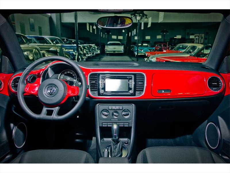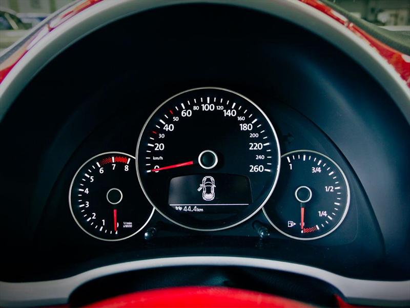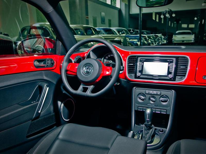 Los interiores están muy bien logrados, tienen un ligero sabor de clásico Beetle gracias a los paneles de las puertas con insertos al color de la carrocería así como en el tablero y el volante… ¿qué creen? el florerito que tenía la anterior versión del Beetle, desapareció, ¡afortunadamente! El cuadro de instrumentos es sencillo pero bastante ergonómico, le presenta al conductor toda la información del funcionamiento del vehículo mediante tres circunferencias, la más grande es para el velocímetro y en su interior hay una pantalla de cristal líquido con información adicional. El instrumento central está flanqueado por otras dos circunferencias más pequeñas, a la izquierda un tacómetro que marca hasta las ocho mil revoluciones y a la derecha un inmenso medidor de consumo de combustible. Un dato irónico es que las primeras ediciones del clásico Beetle en los años cincuenta no tenían medidor de combustible ¿por eso ahora lo pusieron tan grande? Al centro del tablero encontramos un buen equipo de audio, con pantalla táctil que en el caso de nuestra unidad de prueba contaba con el sistema “Media In” que no es otra cosa que un cable de conexión oculto para el iPod. Dicha conexión está en una de las guanteras –si, tiene dos- y la calidad de audio es una de las mejores que hemos escuchado en vehículos de este rango de precio. También tiene entrada para tarjetas SD y cuenta con Bluetooth como protocolo de comunicación con teléfonos celulares. Lo más extraño es que teniendo todos estos “gadgets”, el volante no tenga controles para el equipo de audio ni el teléfono. Un detalle que nos parece curioso es que las bocinas instaladas en las puertas, tienen un bisel iluminado que puede cambiarse de color -blanco, azul o rojo- mediante un selector en el tablero. También la tonalidad de las luces ambientales instaladas en los paneles de las puertas puede cambiarse con dicho control.