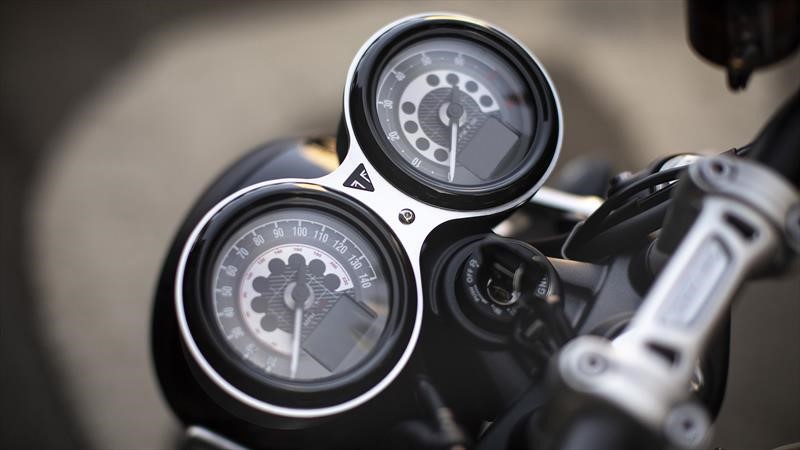 Entre otros detalles, destacan su manillar estrecho, su asiento acolchado de baja altura (807 mm respecto del suelo) y su peso total en seco de 196 kilos, 10 menos que la Thruxton R, un aspecto clave para su maniobrabilidad. También lleva iluminación LED, embrague asistido antirrebote, panel de instrumentos de doble esfera, toma de corriente USB, inmovilizador y sistema de monitorización de la presión de los neumáticos (TPMS) disponible como accesorio.