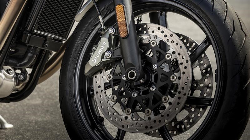 Para detenerse, usa frenos Brembo de cuatro pistones y doble disco adelante y cáliper flotante de doble pistón atrás, con frenos ABS y control de tracción desconectable, aparte de neumáticos Pirelli Diablo Rosso III en llantas de 17".