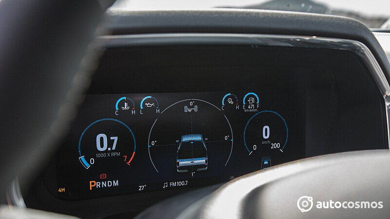 - El cuadro de instrumentos también es digital, pero Ford no lo hizo radicalmente futurista, sino que más bien funcional. O sea, no usa el soporte virtual para añadir atractivo al auto, sino que para que sea más fácil elegir que queremos monitorear. Eso sí, los display para los modos de tracción, esos si son realmente vistosos.