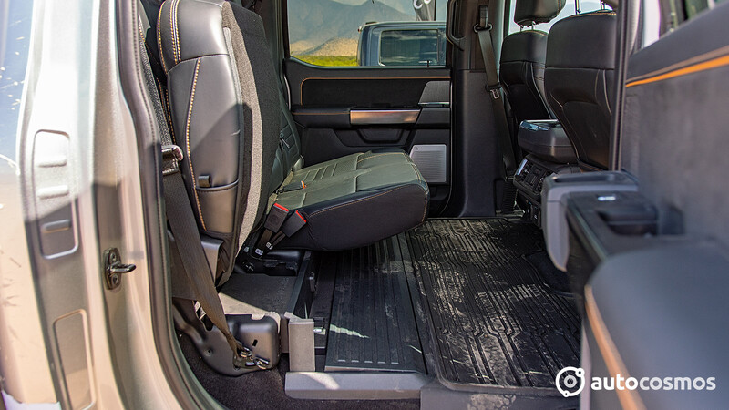 - Todos sabemos que la F-150 es enorme por dentro y que los asientos traseros se pliegan para poder tener otra zona de carga. Pero la gente de Ford fue muy viva y aprovechó ese espacio para generar una cajonera plegable, lo que significa que puedes guardar cosas bajo los asientos (si lo necesitas) y sin que anden bailando en el suelo. Lo mejor: cuando pones los asientos en su lugar, se transforma en un compartimiento seguro, al que le puedes echar llave.