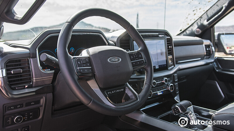 Por dentro, los cambios comienzan a ser mucho más aparentes, tanto en ergonomía como en calidad percibida. La última vez que nos encontramos con una Platinum, el interior tenía algunos detalles más finos que en otras versiones de la F-150, pero ahora hay más acabados cromados y nuevas texturas, como algunos insertos de madera opaca que le lucen muy bien.