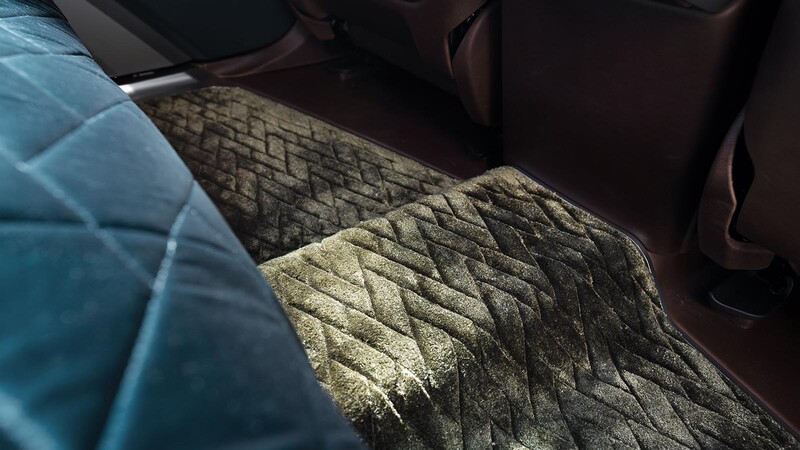 - El color "petróleo" que contrasta en algunas zonas bajas del tablero frontal, domina todo en las plazas traseras, dejando claro que no es lo mismo quien maneja que quien disfruta sentado atrás. La banca trasera (que parece un sofá), trabajada en cuero y terciopelo, ambas con una sensación metalizada, imitan los respaldos de las butacas delanteras.