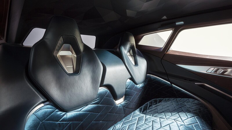 - La parte trasera muestra los focos LED de BMW, los cuales han sido reducidos a solo un trazo, el cual nace desde la tapa del maletero, sube como una onda en los hombros del auto y baja verticalmente hacia abajo de los parachoques, marcando el ancho completo del auto. Además, estos focos parecen desvanecerse en una sección del parachoques, emergiendo en la parte más baja, como si fuesen dos secciones distintas, lo que además le da dimensión, puesto que los grupos ópticos son en 3D.