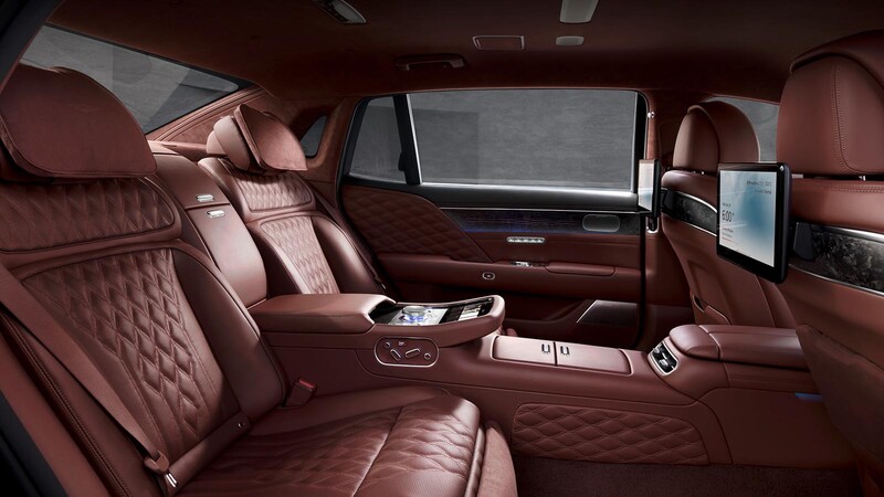 - Los asientos traseros tienen dos monitores táctiles de 10,2 pulgadas, más un panel táctil de 8 pulgadas en el centro, para controlar masajes, iluminación, cortinas, etc.