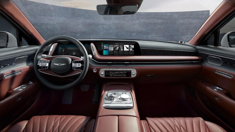 - Nuevos acabados: Genesis empleará algunos materiales que apelan la filosofía de "lujo sostenible" como por ejemplo insertos de madera trabajada con residuos del papel de diario. También hay otros más ostentosos, como los que están presentes en los insertos metalizados del auto, fabricados con la técnica coreana artesanal "sanggam" la cual permite ir grabando algunos de los motivos de Genesis (el patrón de G o las líneas dobles simétricas) en materiales como metal, madera porosa o superficies de fibra de carbono forjada.