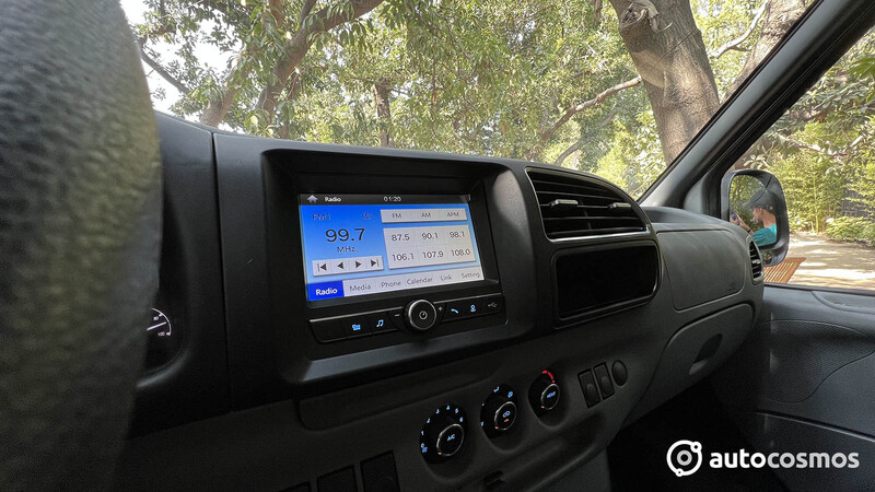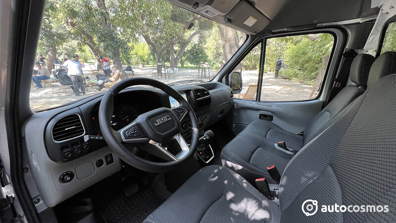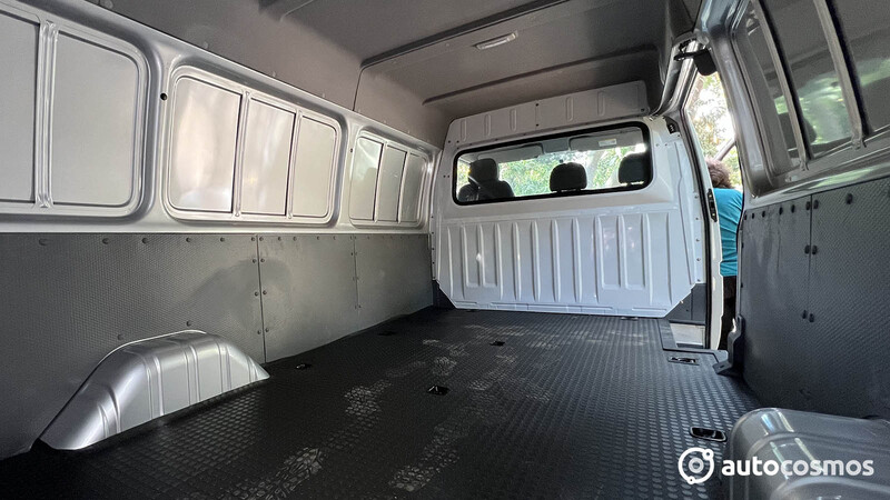 Por dentro, el interior es bastante utilitario y ofrece espacio para tres ocupantes, los cuales estan separados de la zona de carga por una mampara metálica que cuenta con una ventana de supervisión.