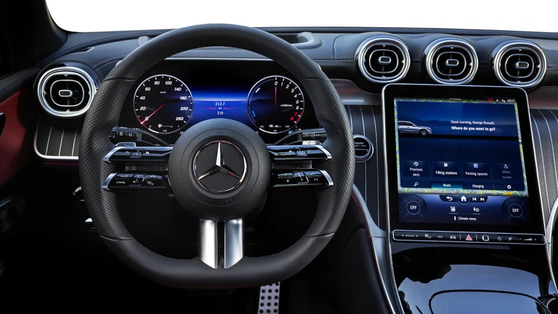 Todo parte por la configuración de dos pantallas, una de 12,3" para el cuadro de instrumentos, y otra en disposición vertical de 11,9" para el sistema de infoentretenimiento MBUX, que asume la quinta iteración que debutara en la Clase S, y que es un 50% más rápido que su antecesor.