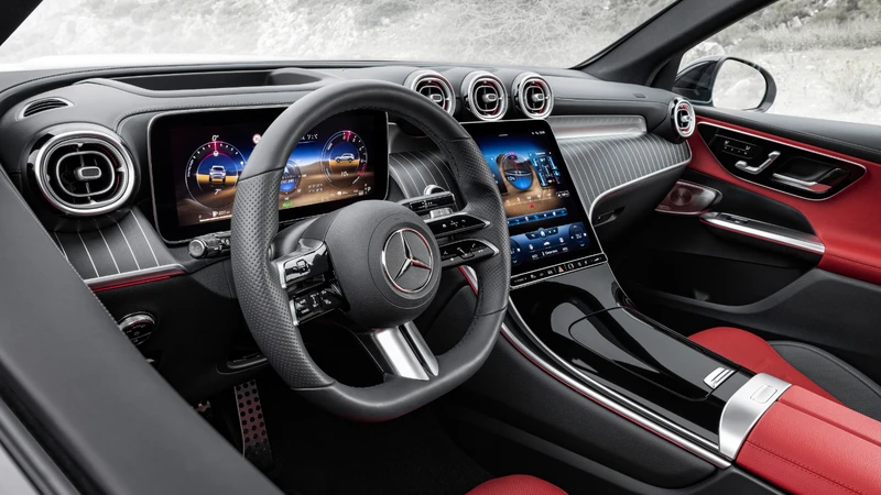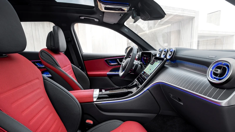 Los asientos y el volante son nuevos, derivados de los nuevos sedanes de la marca, con capas y superficies contorneadas, reposacabezas integrados y ajustes eléctricos. y su conexión al respaldo con una funda cerrada. El nuevo GLC estará disponible con un tablero revestido de cuero (de serie para AMG Line) y algunos elementos de adorno que simulan chapas de madera marrón o negra o fibra de carbono. También cuenta con incrustaciones de aluminio.