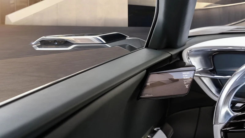 Destaca la pantalla central muy alargada, una consola central flotante y el delgado volante con el inferior achatado. A los costados del tablero hay pantallas adicionales para desplegar la imagen que proyectan las cámaras que sustituyen a los espejos laterales.