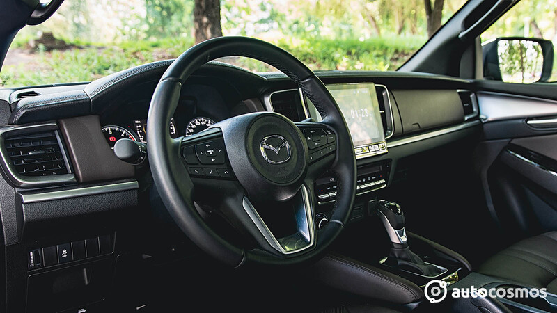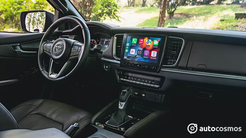 Por dentro el cambio es notable y se agradece, Es aquí donde más se ha puesto énfasis en dar una apariencia de calidad y que se asemeje a la de los modelos de Mazda que ya conocemos. Si bien el diseño de todo es 100% Isuzu (hay que ser sinceros, de Mazda solo encontramos la insignia que decora el volante), cuando vemos plásticos negros con asientos de cuero café, al menos en las versiones más altas, inspira la misma sensación que en los modelos GTX de pasajeros y hasta, de golpe de vista, pareciera que se da vuelta la percepción: un Mazda con reminiscencias de Isuzu. De todos modos, ayuda el hecho de que la nueva D-Max es casi como una Chevrolet Colorado y no sabemos si General Motors quiera traerla a Chile.