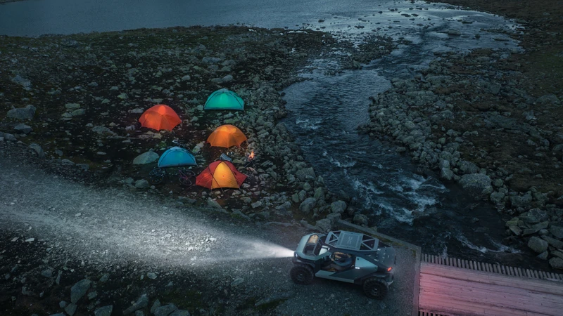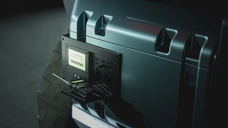 En el frontal hay integrados una cuerda con función de remolque y dos huecos para guardar pequeños objetos. En el techo cuenta con barras modulables para llevar carga con las correas de amarre incluidas, y en la zaga destaca la batería extraíble que permite alimentar a cualquier equipamiento a través de una toma de corriente normal.
