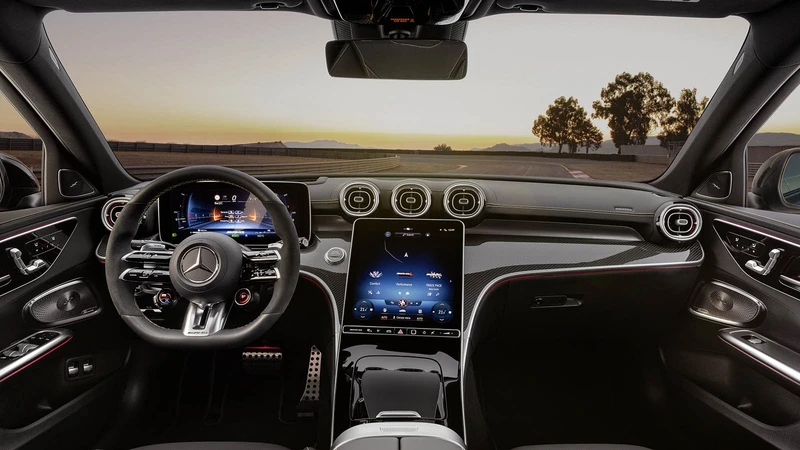 El interior del C 63 S AMG puede ser personalizable a tu antojo, con colores y cueros exclusivos, pero siempre en un tenor que combina lo deportivo con lo refinado, además de los guiños a AMG como el emblema en relieve que se puede ver en los apoyacabezas de las butacas. También llama la atención el volante AMG Performance con diseño de radios dobles, con comandos de facil acceso, los que incluyen el nivel de recuperación de energia del sistema híbrido (cuatro modos).
