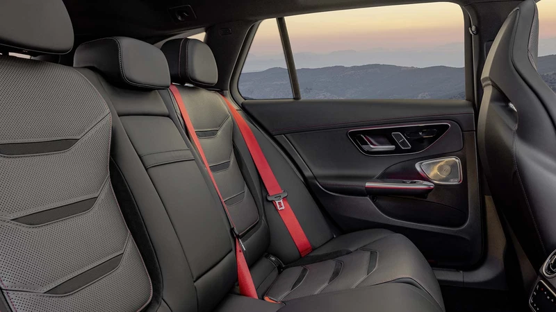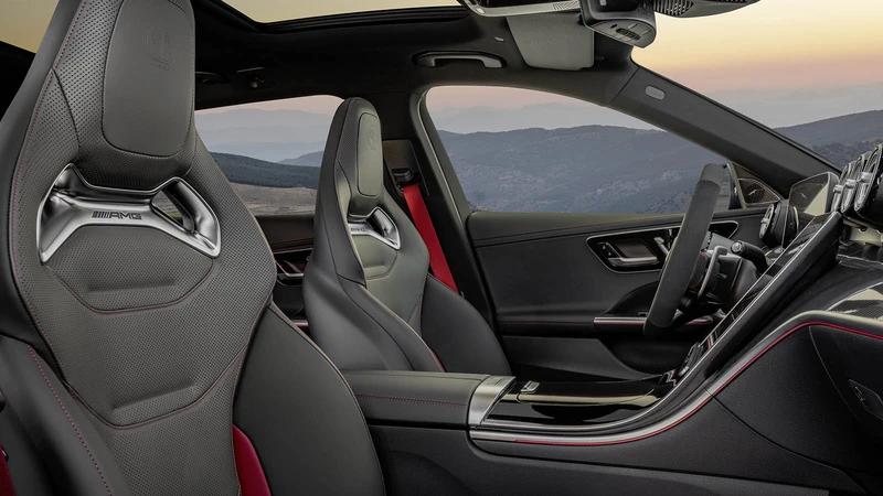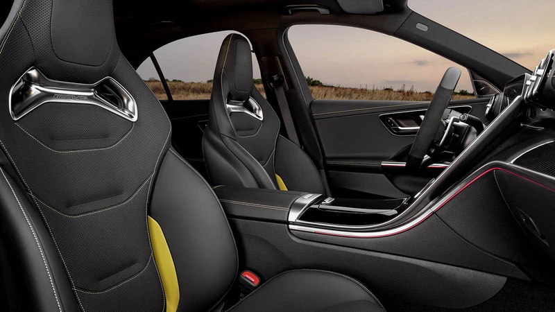 Y ya que hablamos de los asientos, el modelo de asiento AMG Performance se rediseñó por completo. Su característica especial son los cojines laterales con aberturas que ahorran peso y también permiten una mejor ventilación. Cuando se escoje el tapiz de cuerp nappa, están equipados con cuero de napa, se acentúan en un color de contraste. La forma del respaldo se estrecha hacia abajo. El logotipo AMG se sitúa ahora entre las aberturas cromadas mate bajo el reposacabezas integrado.