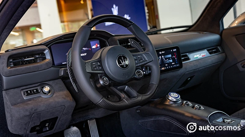 Por dentro, el MC20 presenta un diseño simple pero donde nada se dejó al azar. Los asientos, por ejemplo, son fabricados por Sabelt y logran un equilibrio perfecto entre lo deportivo y lo confortable. Si quieres más sujeción, también hay butacas de fibra de carbono como opcional. El resto, está todo revestido de Alcántara, con costuras contrastantes y, para el caso de las dos unidades que se presentaron hoy, un paquete opcional de fibra de carbono para el túnel central, el volante y las paletas del sistema de cambios.