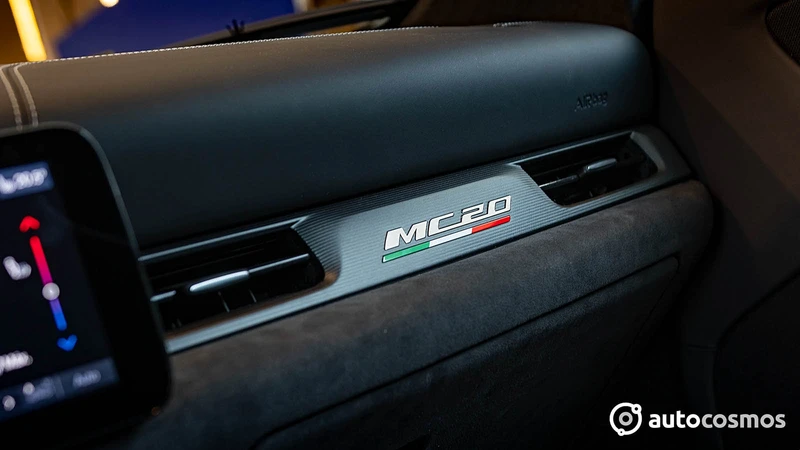 En el túnel central, un dial de aluminio con fondo azul permite regular los cinco modos de manejo del MC20 (GT, Wet, Sport, Corsa y ESC Off), acompañado de algunos comandos menores para los alzavidrios eléctricos, los comandos del sistema multimedia y un espacio portaobjetos bajo el apoyabrazos. El resto de los comandos, están en el volante, incluyendo el botón de encendido y el sistema de Launch Control.