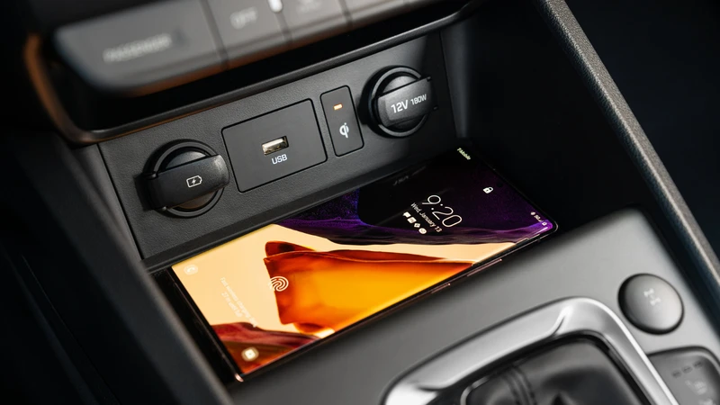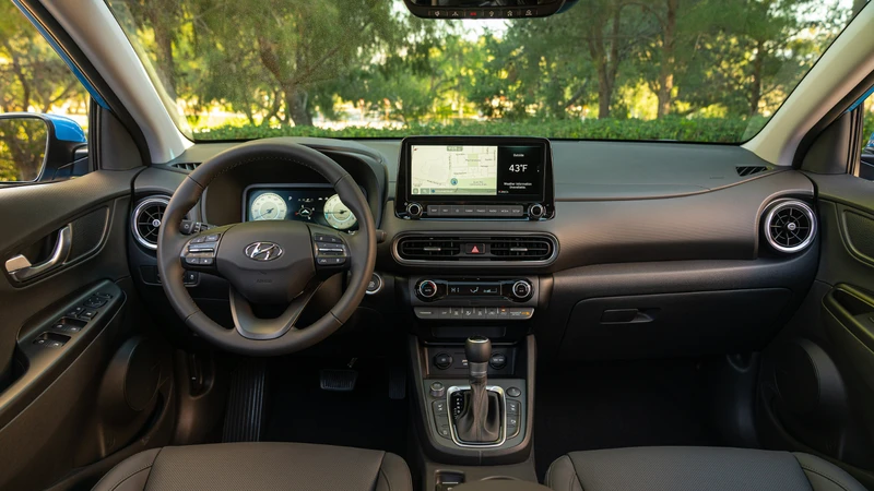 En el interior hay muchas más diferencias, partiendo por la consola central, que en el EV es limpia gracias al uso de una botonera para los cambios, mientras que en este Kona híbrido está más congestionada por la palanca de cambios.