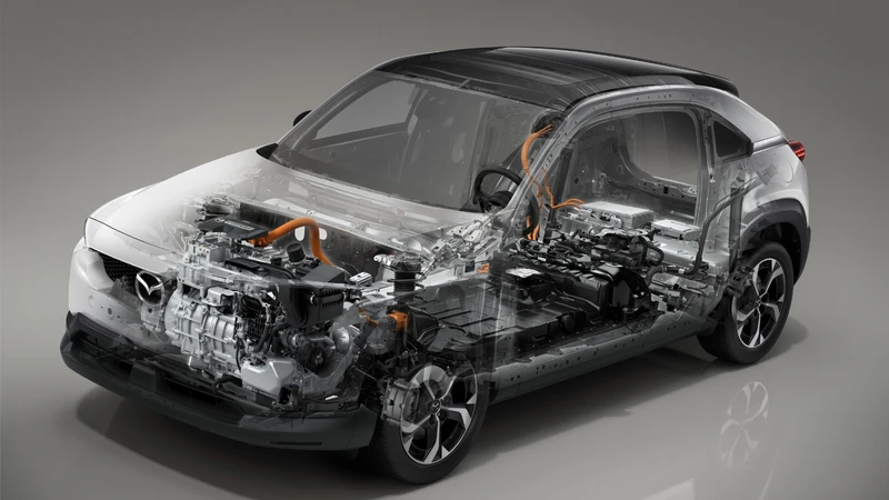 Volvamos al nuevo Mazda MX-30 e-Skyactiv R-EV que se estrena en Bélgica. Tiene un sistema híbrido enchufable en serie (también conocido como eléctrico de rango extendido), que está formado por un motor rotativo 8C de gasolina, un motor eléctrico y una batería de ion-litio con 17,8 kWh de capacidad.