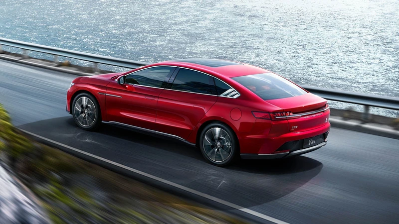 El Han EV es un modelo de imponente presencia, pero no lo hace por medio de grandes parrillas o diseños exuberantes. Quizás es su silueta bien formada y su tamaño, los que llaman bastante la atención. Cuenta con una trompa en cuña y un habitáculo tendido que cae hacia una zaga muy corta. Recuerda un poco al Peugeot 508, por si necesitas alguna referencia.