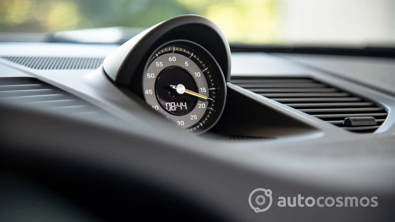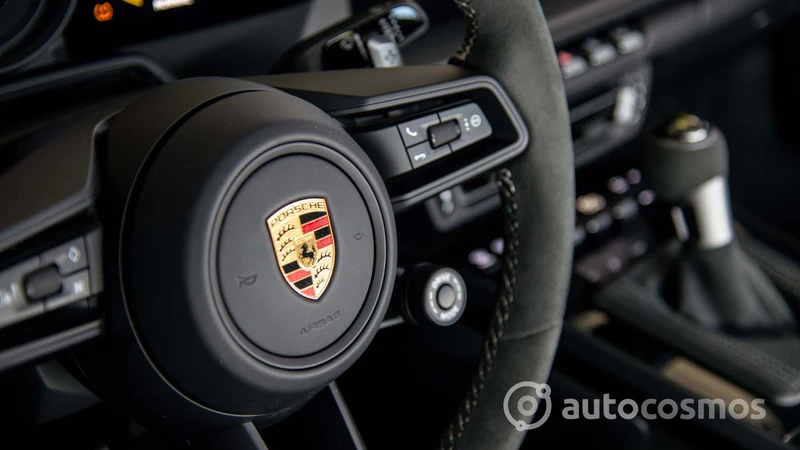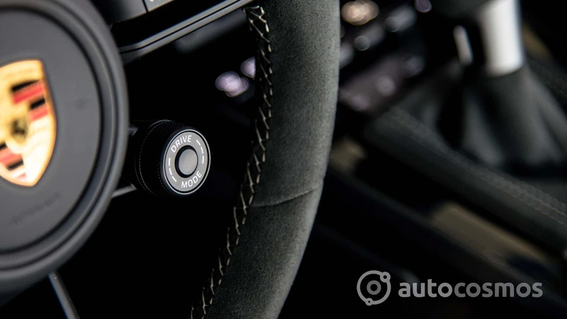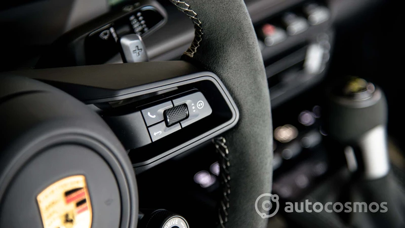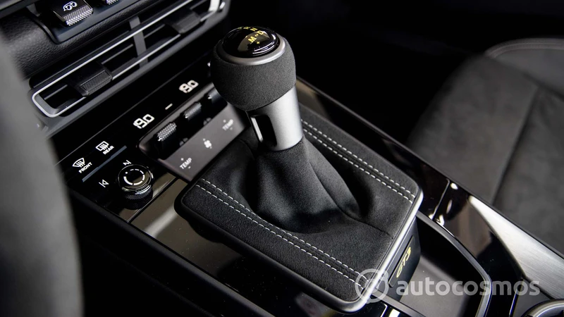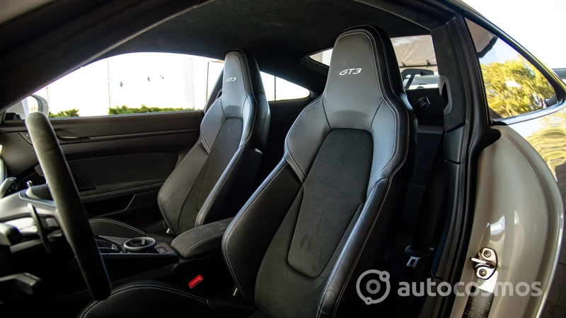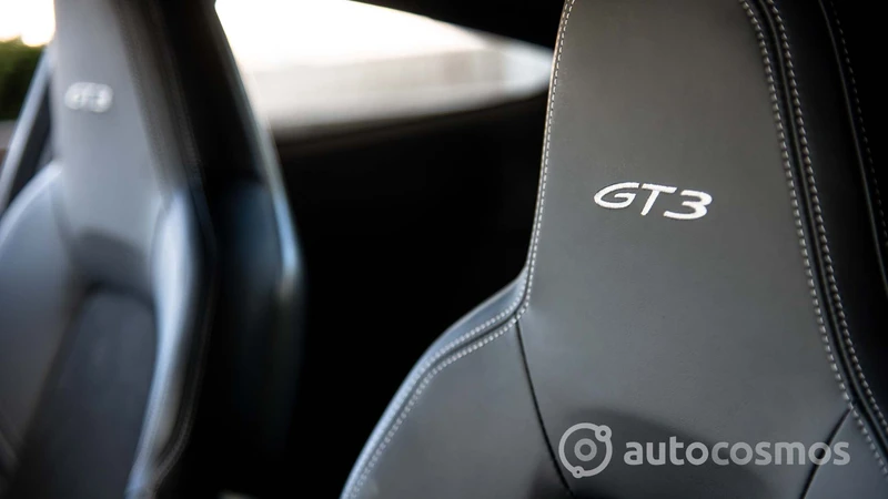 Por ejemplo, los asientos están tapizados en cuero y cuenta con regulaciones eléctricas, pero llevan muy bien bordado el logo GT3 en el apoyacabezas. Cuenta con varios bolsillos y espacios para dejar cosas, aunque siguen cabiendo pocas cosas ahí. Se mantiene la pantalla central del sistema PCM, pero también se muestran instrumentos específicos, como un tacómetro analógico con el corte a las 10.000 rpm. Y la palanca de cambios es más grande para poder usarla de manera más sencilla.