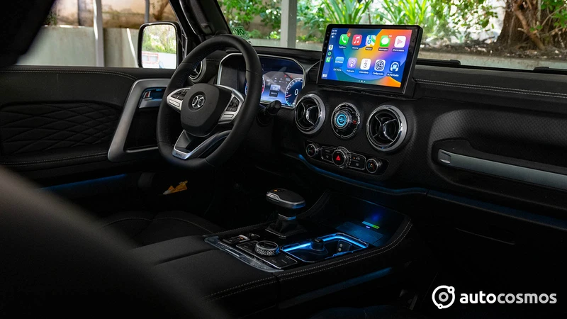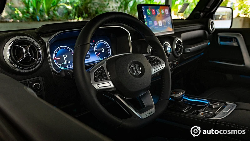 Por dentro es donde el BJ40 muestra su real vocación. Con cuero, detalles metalizados y tanta luz decorativa, queda claro que no es un todoterreno que llevaríamos a la aventura y está bien, porque doy firmado que la gran mayoría de los clientes de estos autos, no llega más que a la playa. Por mucho bloqueo de diferencial y suspensión robusta que tenga, lo veo más como un auto para hacer overland que para ir a abrir ruta a algún raid. Aun así, puedes sacarle las puertas y el techo.