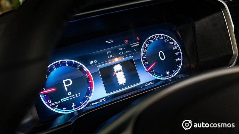 La primera pantalla corresponde al cuadro de instrumentos, de 12,3", con dos temas de visualización. El primero, de color azul, tiene tacómetro y velocímetro visibles, mientras que el otro, de color amarillo, está orientado al uso offroad y permite monitorear más cómodamente algunos elementos como brújula, inclinación, la carga del turbo, etc. Eso sí, por temas de traducción, manejar el menú de esta pantalla es un poco complicado y lo que más me molesta es que los consumos están en L/100 km y no en "kilómetros por litro" como debería ser.