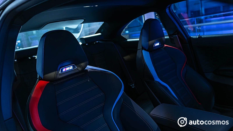 - Butacas M multifunción con reglaje eléctrico, memoria, calefacción, logos "M2" retroiluminados y tapiz de cuero Vernasca con costuras y acentos en el tricolor de M