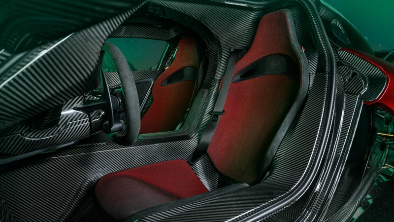 El interior está libre de comodidades y lujos innecesarios, mostrando la fibra de carbono en varios lados, mientras que se utiliza material técnico ultraligero para tapizar los asientos y secciones de las puertas y el tablero.