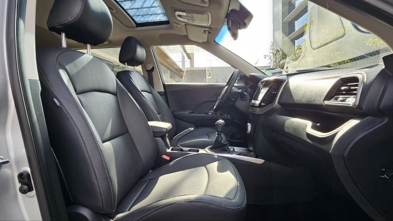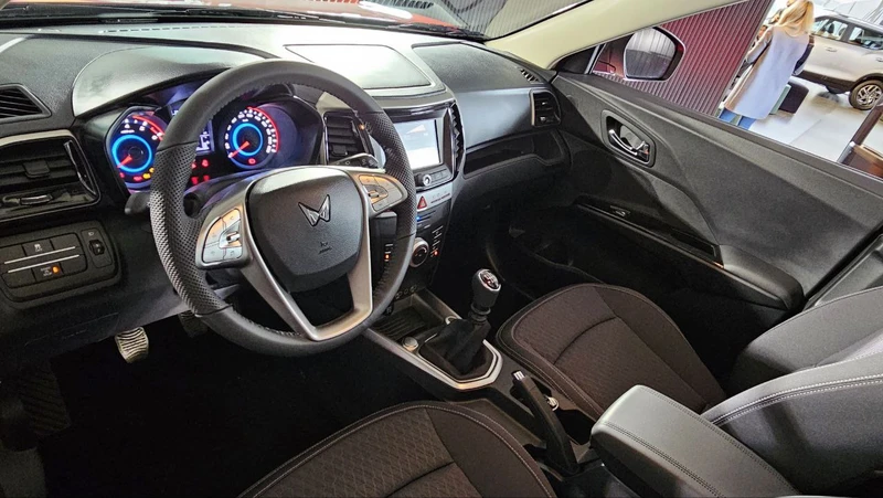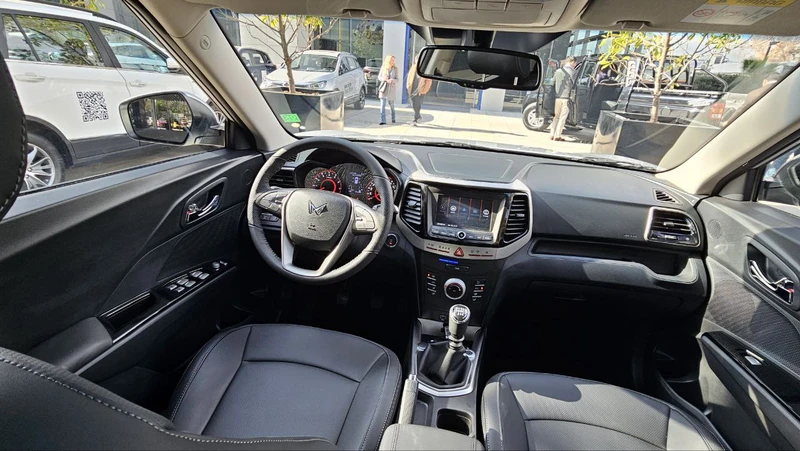 El interior es sobrio, tanto en materialidad como en diseño. Destaca una pantalla multifunción de 7 pulgadas puesta en el centro del tablero y envuelta en salidas de aire de diseño asimétrico, unos manos del aire acondicionado puestos más abajo, y una consola baja y sencilla con posavasos.