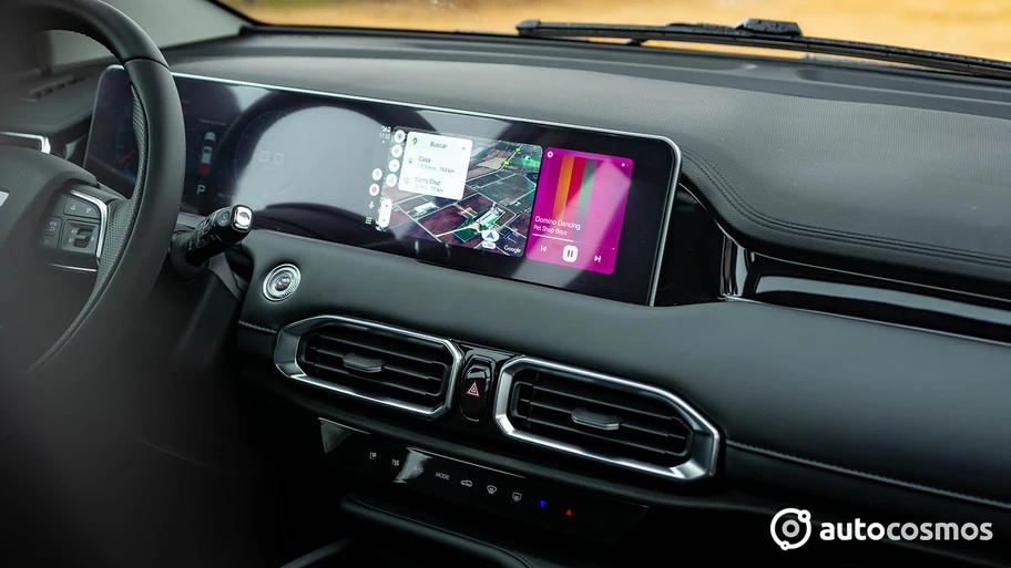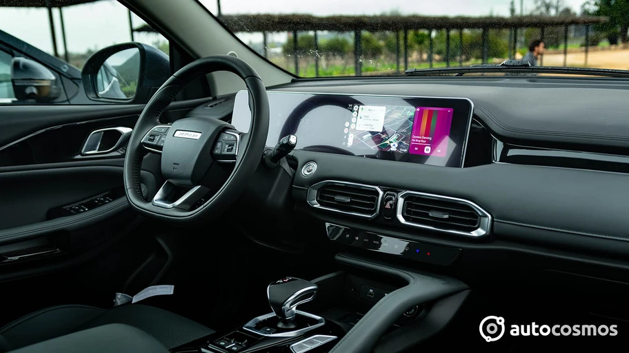 El diseño general del habitáculo toma bastante de los modelos X de Jetour. La apreciación de calidad es alta para lo que acostumbramos en el segmento, con asientos deportivos y zonas acolchadas con cuero sintético, aunque algunos elementos como los botones del volante, la palanca para regular el asiento y otros detalles menores delatan su posicionamiento más económico.
