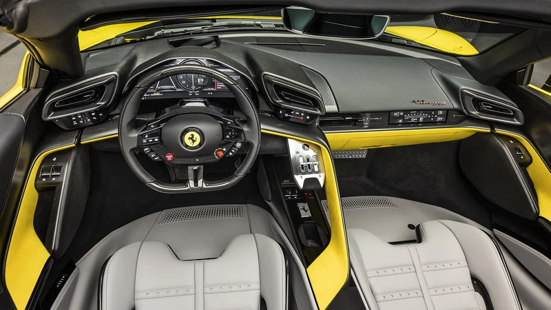 Por dentro todo es más envolvente pero también más físico, gracias a que Ferrari reemplazó algunos (no todos) botones importantes por teclas y botones. Las salidas de aire son más prominentes, el pasajero tiene una nueva pantalla de supervisión y la consola central está más elevada, con el selector de marchas ubicado en una posición más alta y ergonómica.