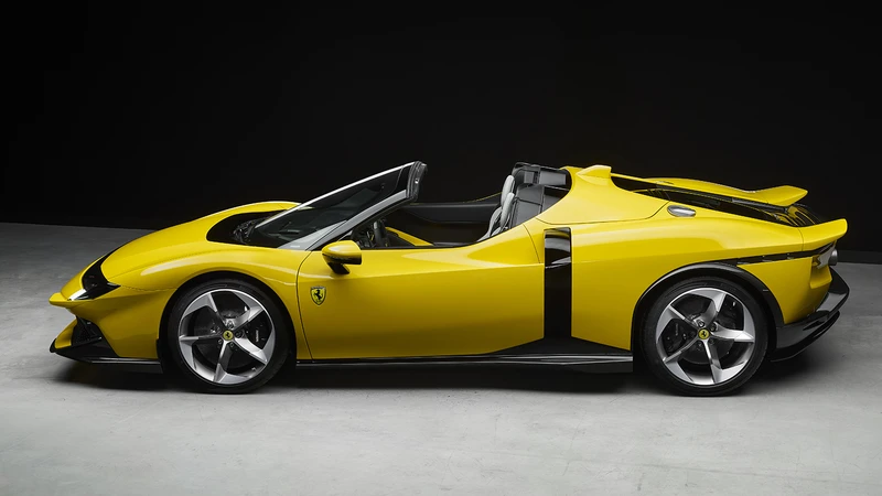 ¿Qué queda del SF90? La cúpula principal y los escapes dobles, pero la verdad es que es un auto más complejo en temas de elementos estéticos. Hay elementos retro como es el perfil de la trompa, muy de Ferrari setentero, así como los arcos que nacen de las tomas de aire, ahora decoradas con una franja vertical, que de alguna manera rememoran las curvas de los Ferrari de antaño y las entradas de aire de la 512 S de 1970, aunque la mayor referencia a este modelo está en la zaga, con una doble cola.