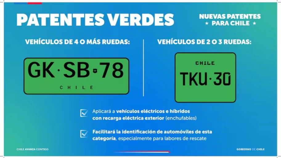 Los vehículos electrificados tendrán su propia distinción, al igual que ya existe por ejemplo con los vehículos de diplomáticos (con placas celestes) o autos vendidos en zona franca (placas rojas). Pues bien, los eléctricos e híbridos, ya sean de cuatro, tres o dos ruedas, tendrán una placa de color verde con letras negras.