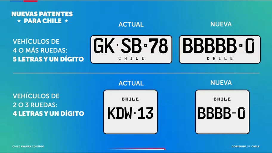 En el caso de los vehículos de cuatro ruedas o más, las nuevas patentes tendrán 5 letras y 1 número, suprimiendo el uso de vocales para evitar la formación de palabras, y comenzarían a aplicarse aproximadamente el año 2029. En tanto para los vehículos de dos o tres ruedas, cuyo caso es más extremo, pues sus combinaciones podrían acabarse para el año 2027, pasaran a tener 4 letras y 1 número.