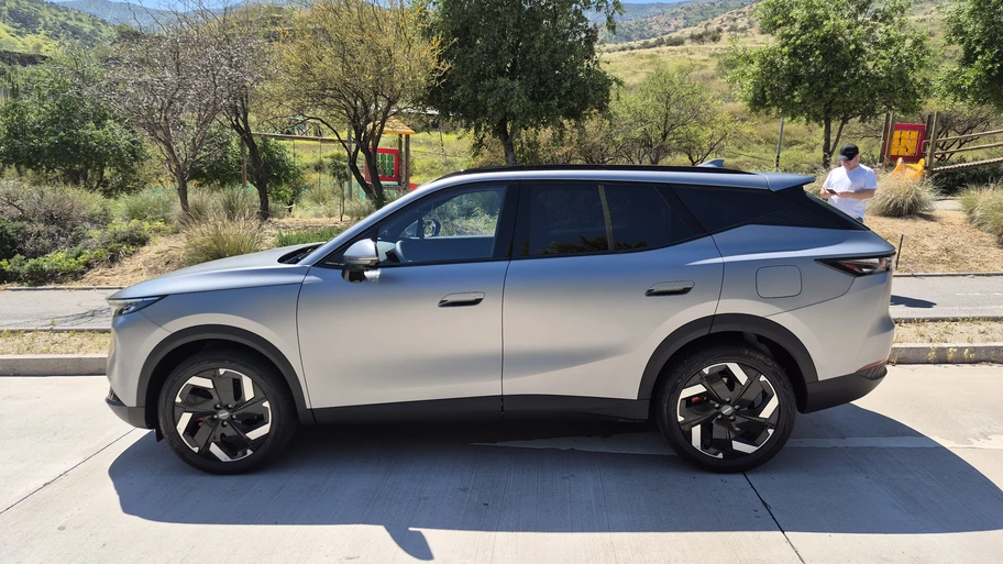 De perfil presenta la clásica apariencia de un Omoda, con manillas de puertas semiocultas con accionamiento mecánico, las que al estar al ras de la carrocería permiten reducir la resistencia y ruido del viento, mejorando la eficiencia. También vemos espejos retrovisores laterales tipo bandera, una línea de techo que alcanza su cumbre en el pilar A,para luego trazar un suave descenso hacia el portalón, sin dejar en el tintero, la presencia de un riel de techo integrado, además de una antena tipo "tiburón" a tono con el color de la carrocería", que luego se funde en el spoiler superior bitono. Las versiones intermedia y más equipadas, presentan vidrios traseros laterales y posteior oscurecidos. Se desliza sobre neumáticos Giti Comfort 225 de medida 235/50 R18 para la versión de entrada Comfort, mientras que las Luxury y prestige calzan neumáticos 235/50 R19. Todas con llantas de aleación.