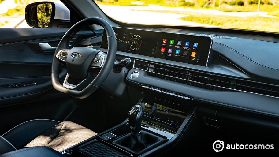 Los asientos son de tipo butaca, con cojines algo duros, pero con buen soporte y postura. Podemos tener buena visualización hacia el clúster digital de 10,25" el cual tiene tres temáticas de visualización: la mejor es la tradicional, por lo legible. El computador a bordo está en el centro y es relativamente completo en sus funciones. En el mismo panel panorámico, encontramos la pantalla de 10,25" del sistema multimedia, de interfaz limpia y fácil de entender. Lo bueno es que Chery mantuvo una teclera con acceso principal al volumen o menú principal, algo que está excelente en temas de usabilidad. Esta pantalla cuenta con tres enchufes USB y soporte inalámbrico para Apple CarPlay y Android Auto, además de Bluetooth.