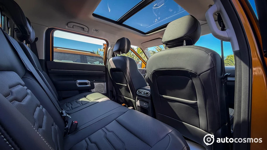 Los asientos traseros, además de ser amplios y de mejor postura que la gran mayoría de las camionetas, tienen una función de plegado, lo que permite generar un volumen de 960 litros, ideal para llevar cosas que no quieres que se vean o que sean delicadas: un televisor, maceteros con plantas, etc. Con plegado nos referimos a que tanto el respaldo se puede plegar hacia abajo, como los cojines inferiores hacia arriba. El apoyabrazos tiene un tamaño de 6 litros, bastante generoso.