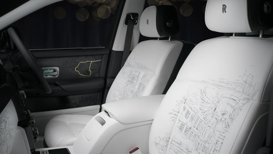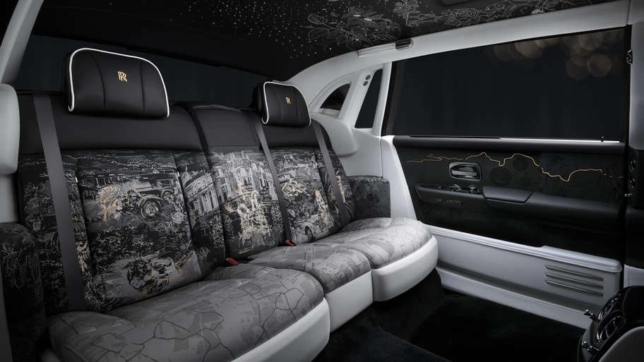 Los asientos traseros de Phantom Centenary están inspirados en el famoso ' Fantasma del Amor ' de 1926, encargado con tapices Aubusson tejidos a mano. La obra de arte de los asientos se despliega en tres capas narrativas todas impresas en alta resolución. La primera es el fondo, que muestra lugares y objetos de la historia del Phantom, desde las instalaciones originales de la marca en Conduit Street, Londres, hasta los óleos del sur de Francia de Henry Royce. La segunda retrata grandes Phantoms del pasado con gran detalle. La tercera está formada por bordados que representan de forma abstracta a siete propietarios importantes de cada generación del Phantom.