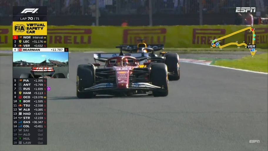 Cuando faltaban apenas dos vueltas para el final, la FIA activó el Auto de Seguridad Virtual (VSC) luego de que el Williams de Carlos Sainz quedara detenido a un costado de la pista con humo saliendo del motor. En ese momento, Verstappen atacaba a Charles Leclerc (Ferrari) por el segundo lugar, y la neutralización terminó sellando las posiciones hasta la bandera a cuadros, pese a que hubo velocidad en los metros finales.