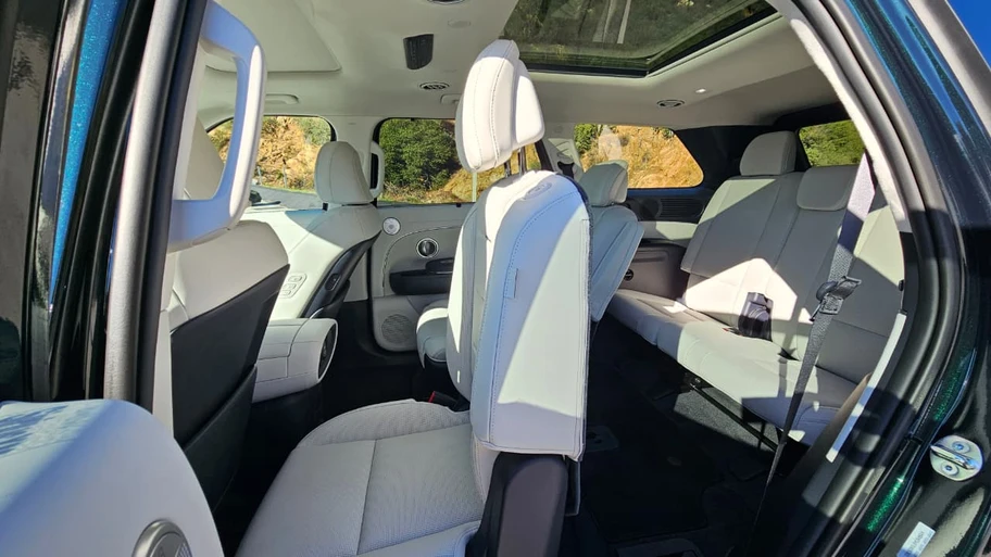 Y ojo, que el maletero es enorme incluso con las tres filas en uso. Lo bueno de que sean todos eléctricos, es que al abatir la tercera fila, los asientos de la segunda fila se deslizan automáticamente hacia adelante, lo cual resulta práctico.