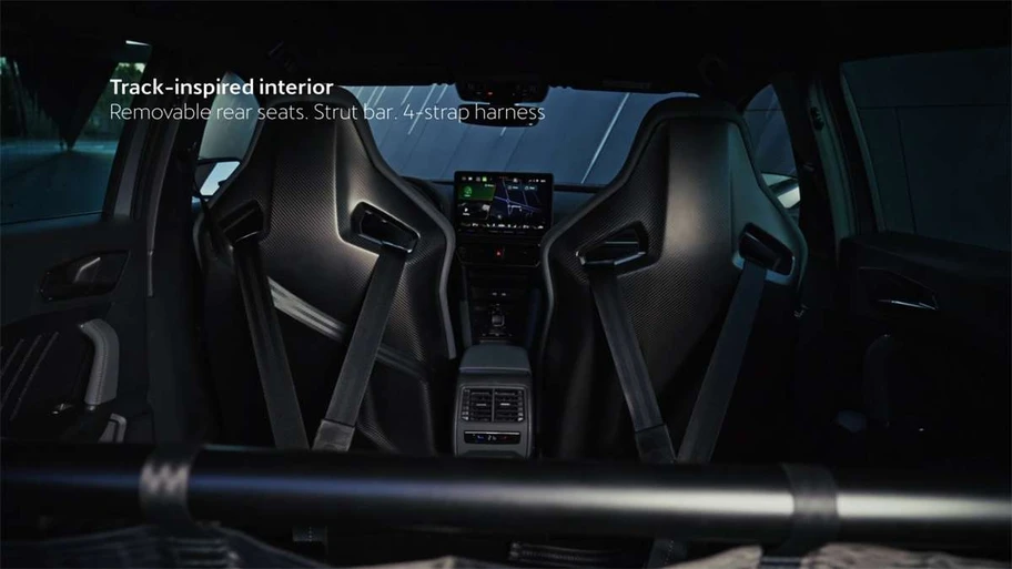 Sin embargo, lo mejor está en la cabina, ya que se incorpora una barra de refuerzo tras las butacas delanteras, una malla integrada, arneses de cuatro puntas y asientos traseros removibles, para que puedas tomarte un Track Day en serio.