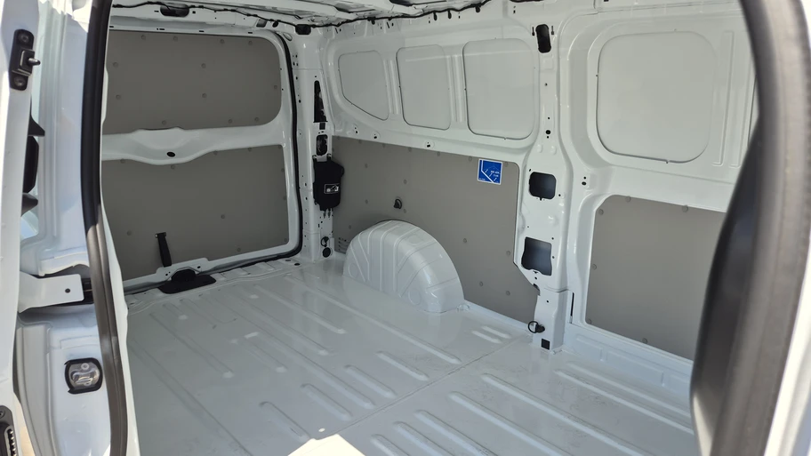 De costado mantiene un diseño limpio, con batalla larga, junto con la presencia de llantas de acero de 16", que son enfundadas por neumáticos de medida 215/65 R16C. En su costado derecho cuenta con una puerta lateral de 1030 x 1301 mm y puertas traseras de doble hoja, de 1400 x 1316 mm, tienes el espacio ideal para cargar incluso pallets con total comodidad. Tanto la carcasa de los espejos exteriores como las manillas de las puertas presentar terminación en negro estriado. Las luces traseras también son LED.