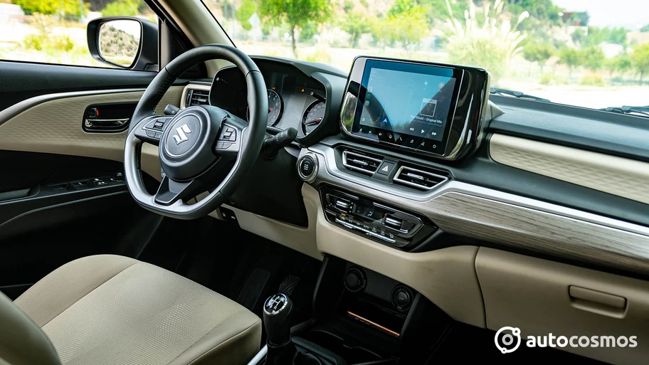 El interior es el mismo que el del Swift, aunque con tapicería beige y acabados símil madera, para un look más elegante y más a tono con el perfil del auto. La consola está ligeramente orientada al conductor y el sistema multimedia está más alto, alineado al clúster para una mejor visibilidad.