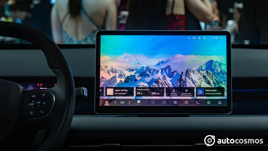 Tenemos un clúster de 8,8", Smart Key con encendido inteligente, volante multifunción de cuero sintético, control crucero, climatizador, luz ambiental, asientos delanteros eléctricos, cargador inalámbrico de 50w, apertura e-latch en las puertas y un sistema multimedia con pantalla de 12,8", impulsado por un procesador Qualcomm Snapdragon 6125, 3 puertos USB, 6 parlantes, Bluetooth y conectividad inalámbrica para Apple CarPlay y Android Auto.