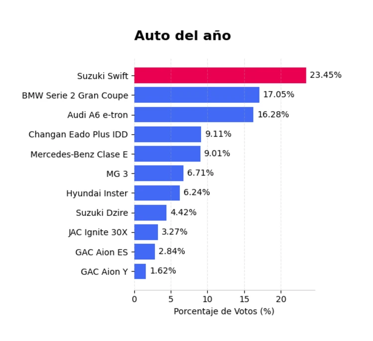Por detrás del modelo fabricado en India se ubicó el BMW Serie 2 Gran Coupé, con el 17,05% de los votos, y el Audi A6 e-tron, con el 16,28%.