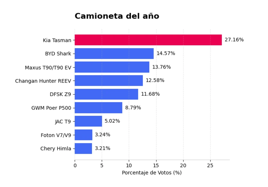 Por detrás de la camioneta mediana la eléctrica BYD Shark, con el 14,57%, seguido de la Maxus T90 (y su versión eléctrica T90 EV), con el 13,76% de los votos.