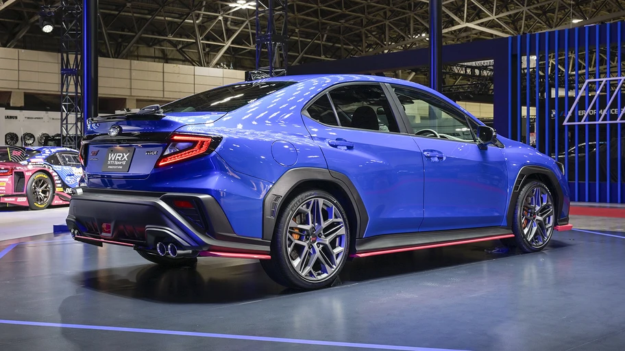 Según tenemos entendido, el auto toma el concepto de "deportividad madura". Esa es la razón por la cual no vemos un gran alerón atrás o llantas doradas. A lo más, el exclusivo kit de faldones exteriores que viene en el tradicional color "Cherry Blossom Red" de STI y los cálipers del kit de frenos Brembo (con seis pistones al frente y dos atrás), el cual luce el logo antiguo de la marca y va pintado de color dorado, tal como los frenos del Impreza WRX STI de segunda generación.