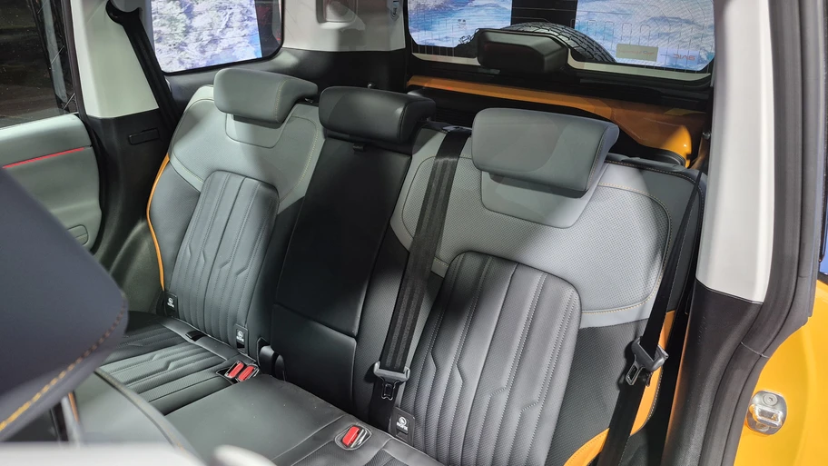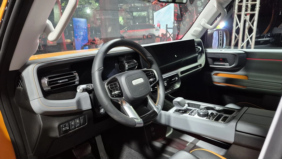 Por dentro nos encontramos con un torpedo con contornos semitectangulares con marcados pespuntes y materiales agradables al tacto, que en cierta medida puede parecer algo "sobrecargado" en cuanto a pantallas, puesto que alberga tres. La primera corresponde al cuadro de instrumentos de 10,25", detrás del volante redondo de tres radios tomado prestado del también nuevo BJ60. Pero lo que más llamó nuestra atención durante nuestra revisión de la unidad, es la pantalla doble que está "flotando" sobre la consola central, que en estricto rigor una es la central de 12,8", además de otra de idéntico tamaño para el pasajero. Inmediatamente bajo ellas, se hallan dos aireadores, separados por el botón de encendido, además de controles físicos para operar el climatizador bizona, intermitentes de emergencia y desempañador delantero/posterior.