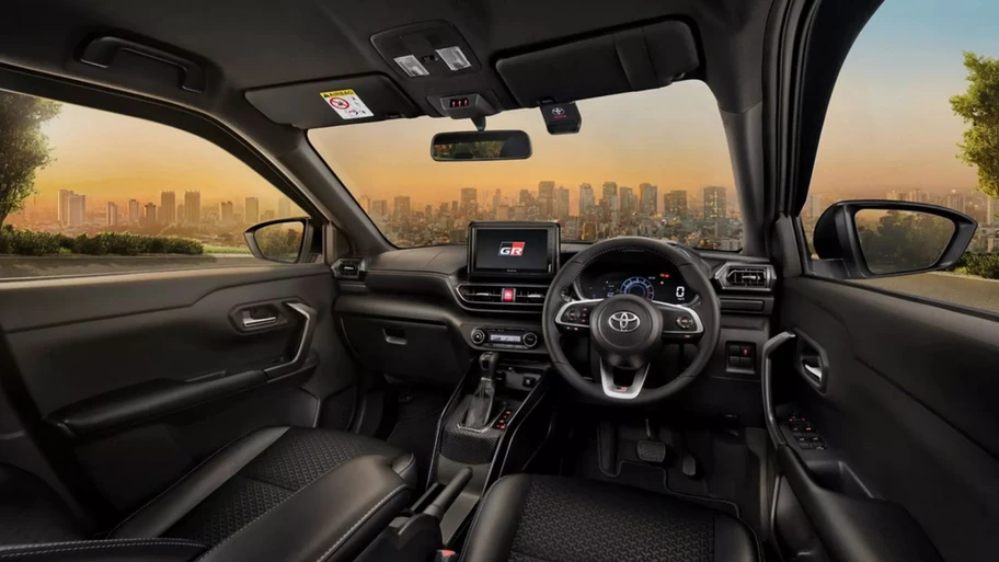 El volante con emblemas GR integra paletas de cambio y un botón con modo “power”, mientras que la lista de accesorios opcionales contempla detalles como logotipos GR para la palanca de cambios y los estribos, además de elementos prácticos como red para el área de carga o un dispensador de fragancia.