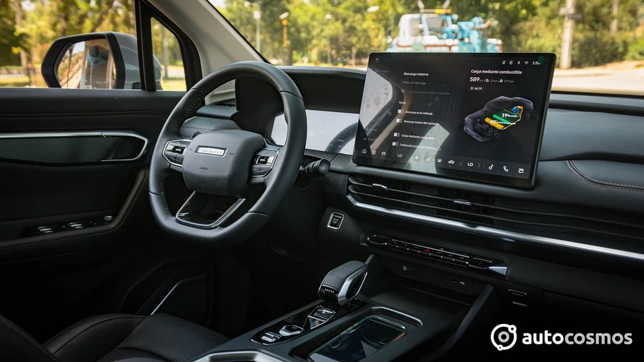 Los motores eléctricos se alimentan de una batería LFP de 19,09 kWh de capacidad, para una autonomía 100% eléctrica de 82 km y un rango total superior a los 1.000 km. Soporta carga rápida (DC) hasta 32 kW de potencia, aunque si utilizas un cargador lento de 6,6 kW, cargar la batería tomara casi tres horas. Hicimos el ejercicio de enchufarla en un cargador rápido, donde alcanzó un peak de carga de 35 kW, para luego bajar a 13,8 kW cuando comenzaba a acercarse al 80% de su capacidad. Nos tomó casi 35 minutos a un precio aproximado de $7.000.